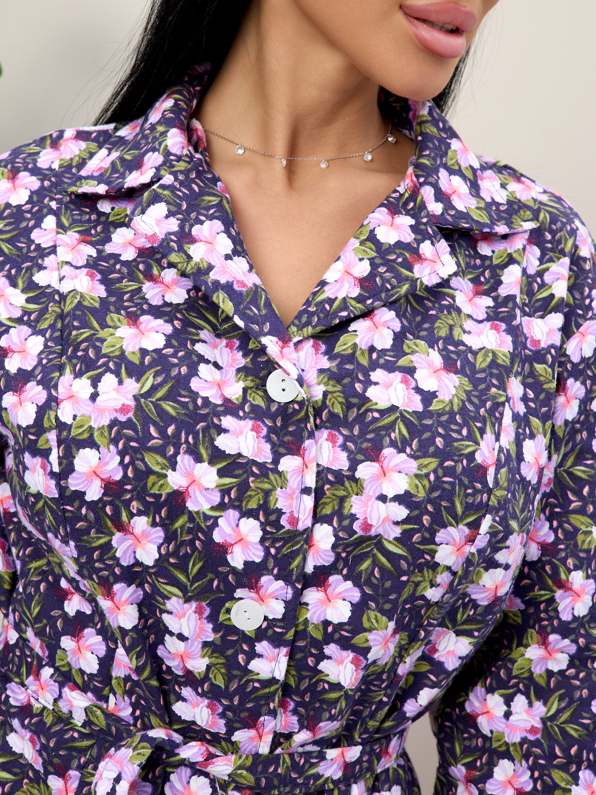 Халат прямой с рельефами, благодаря чему хорошо садится по фигуре, подчеркивая талию благодаря поясу.
