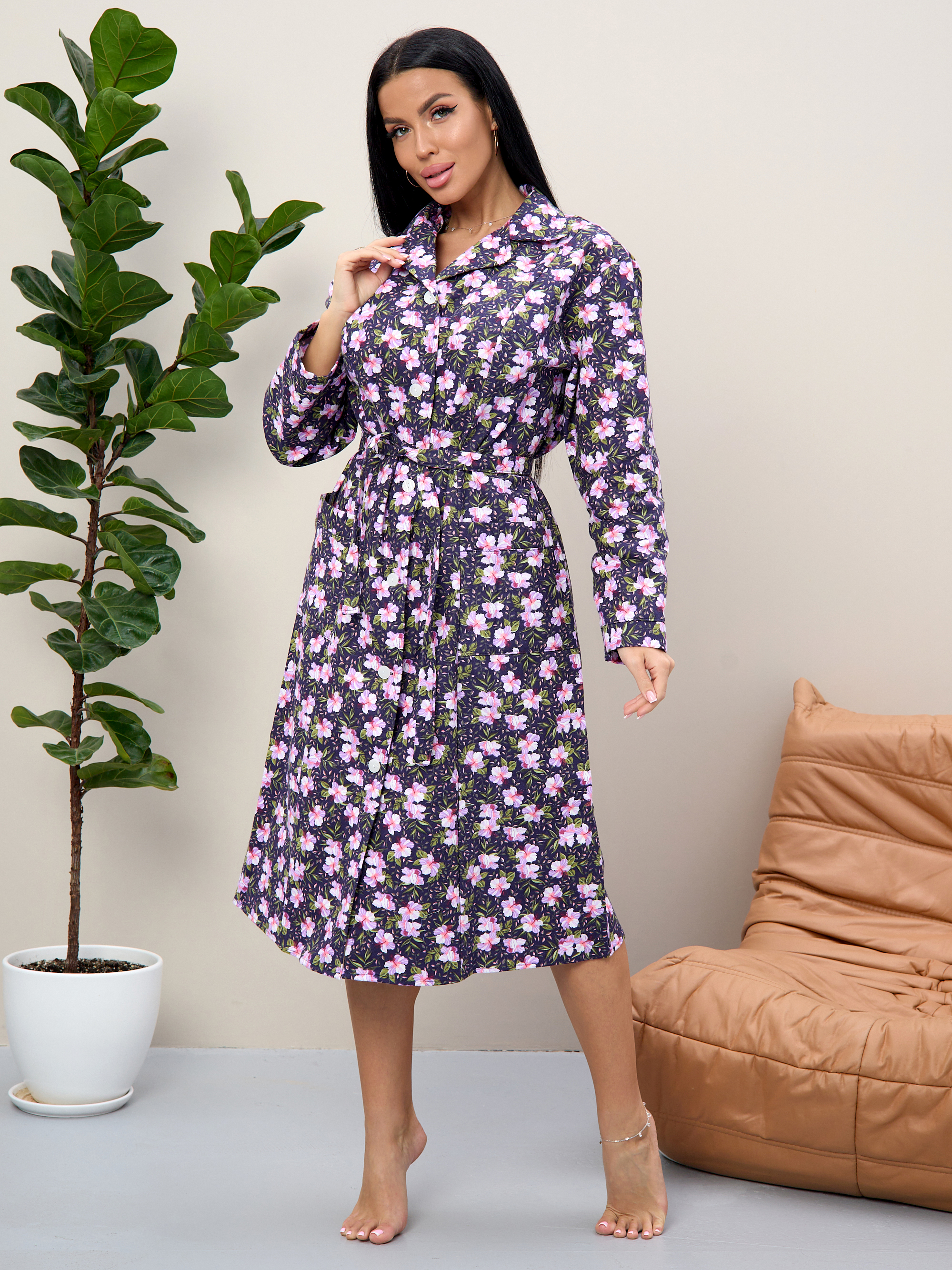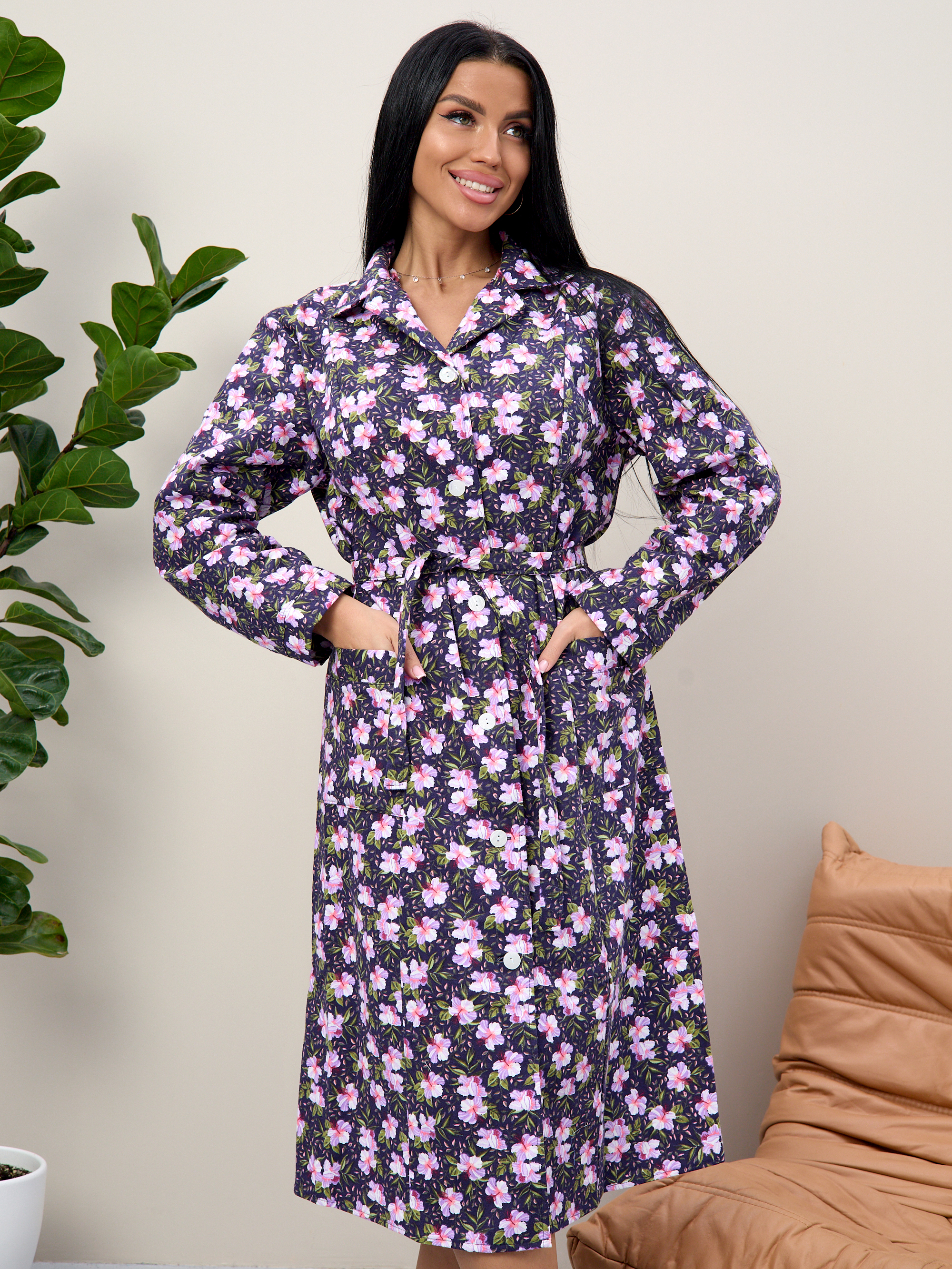 Халат байковый женский с длинным рукавом и накладными карманами на пуговицах.